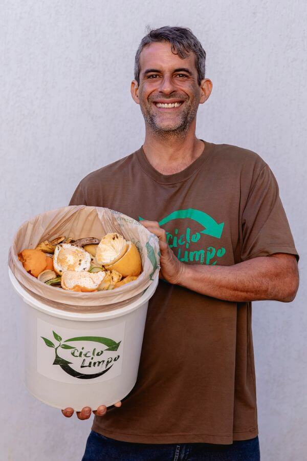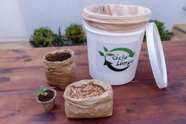Para a separação dos resíduos orgânicos em casa, cada domicílio recebe um balde de 18 litros com tampa e um saco compostável de 30 litros, para armazenar estes resíduos até a data da coleta: